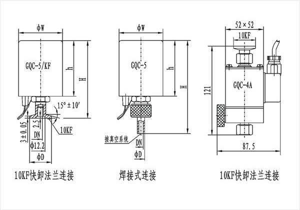 GQC-1.5 GQC-5型電磁高真空充氣閥是以電磁力為動力,當接通電源時,閥門被關(guān)閉,使真空系統(tǒng)與大氣隔離;切斷電源時,閥門處于開啟狀態(tài),隨之大氣由外界引入真空系統(tǒng)。GQC-4A型電磁高真空充氣閥具有通電開啟和通電關(guān)閉兩種功能,閥內(nèi)帶有空氣過濾器,可用作向真空系統(tǒng)充氣。
